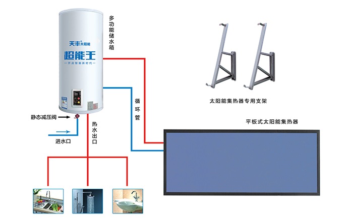 本系統(tǒng)采用天豐陽臺壁掛分體式太陽能熱水機(jī),吸熱部件(太陽能集熱器)與儲熱部件(水箱)分離式安裝,集熱器安裝于南面陽臺上,儲熱部件(水箱)安裝于室內(nèi)陽臺上,然后通過管路把太陽能集熱器、水箱和室內(nèi)衛(wèi)生間、廚房等用熱設(shè)備相連接的一種分戶集熱、分戶儲熱式太陽能熱水系統(tǒng),整個系統(tǒng)為承壓式運(yùn)行,間接加熱。